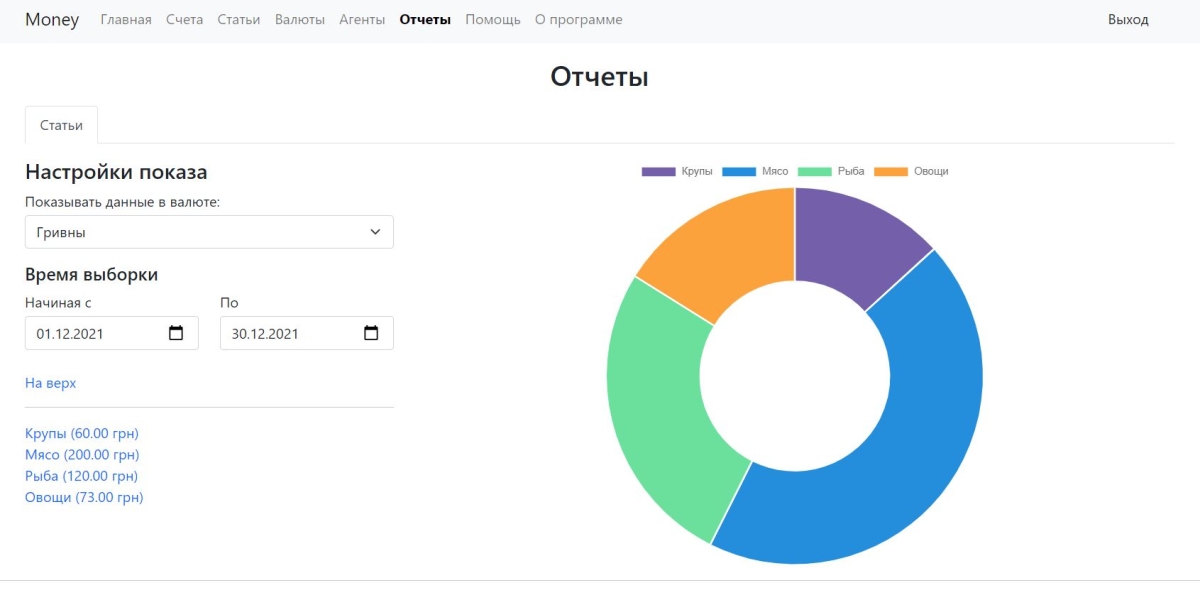 The app provides detailed reports for any selected time period. You can filter transactions by account, category, agent, etc., and view clear graphs and charts.